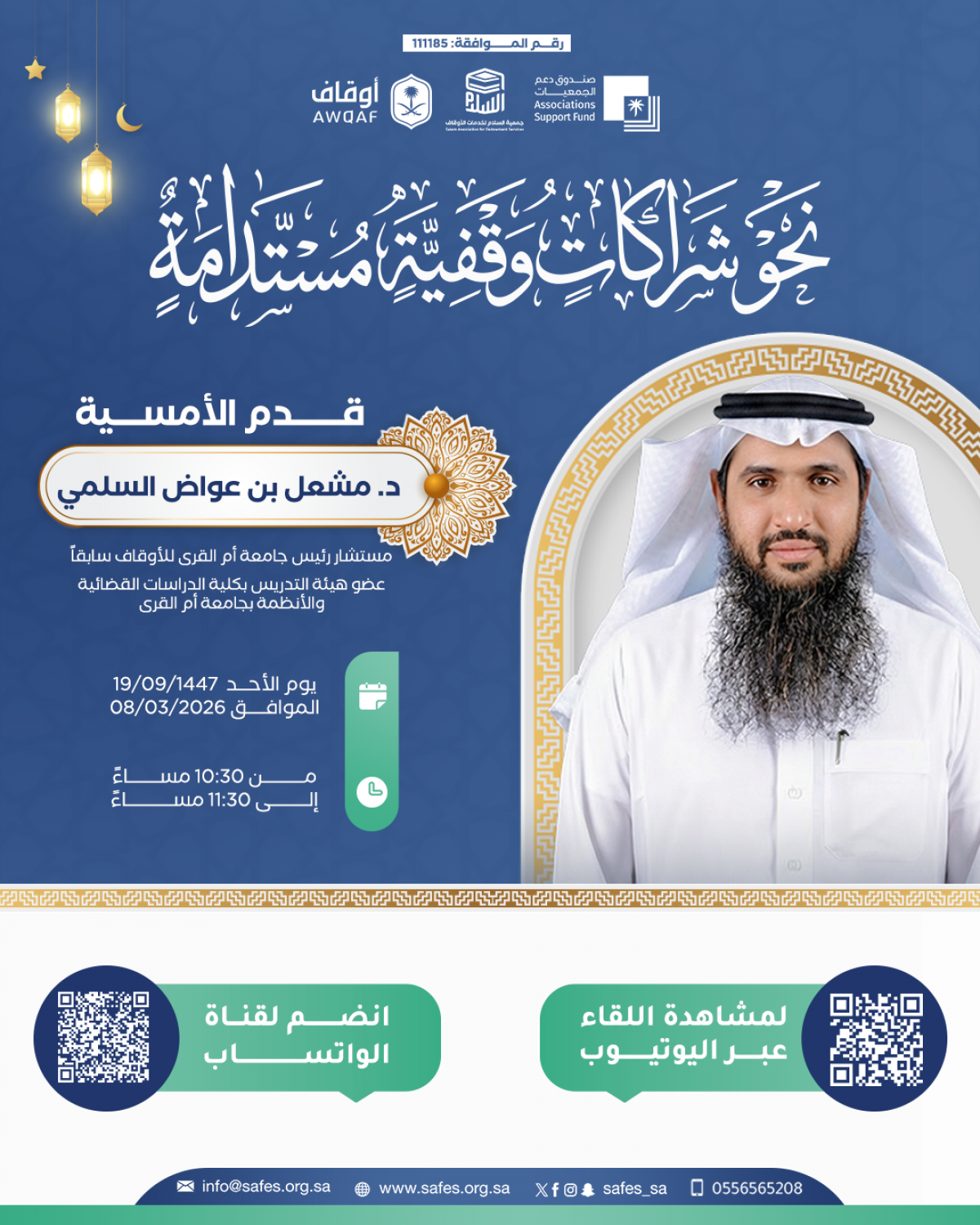 وتأتي هذه الأمسية ضمن جهود الجمعية في نشر الوعي بالعمل الوقفي، وتطوير المعرفة المتخصصة في مجال الأوقاف، وتعزيز فرص التعاون والشراكات التي تسهم في تحقيق التنمية المستدامة للقطاع الوقفي.