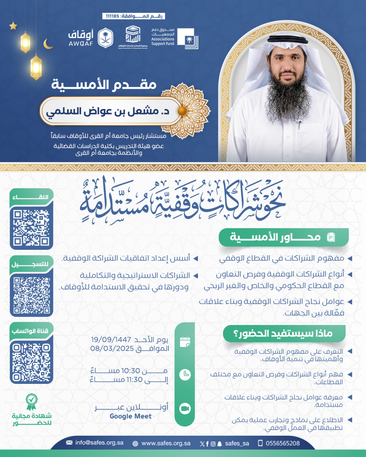 وتناولت الأمسية مفهوم الشراكات في القطاع الوقفي، وأهميتها في دعم تنمية الأوقاف وتعزيز أثرها المجتمعي، إضافة إلى استعراض أنواع الشراكات الوقفية وفرص التعاون مع مختلف القطاعات الحكومية والخاصة وغير الربحية.